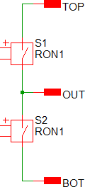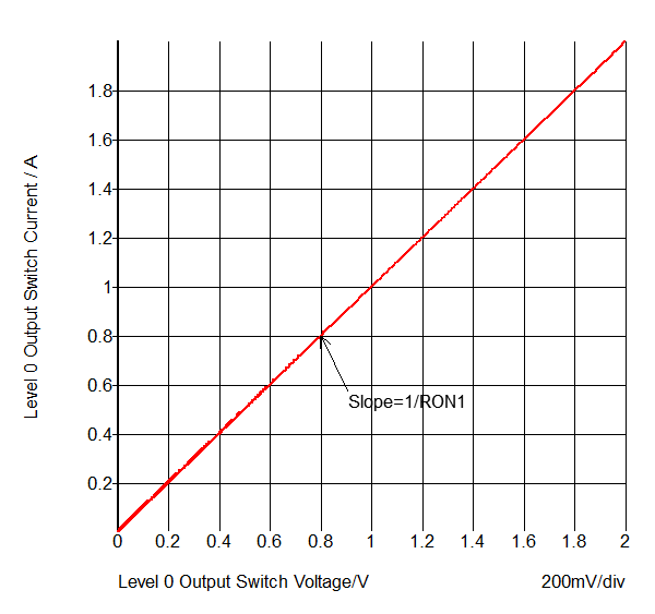 The Level 0 model uses simple switches with on resistance RON1. The output characteristics of one of these switches is shown below with a schematic diagram of the switch configuration.