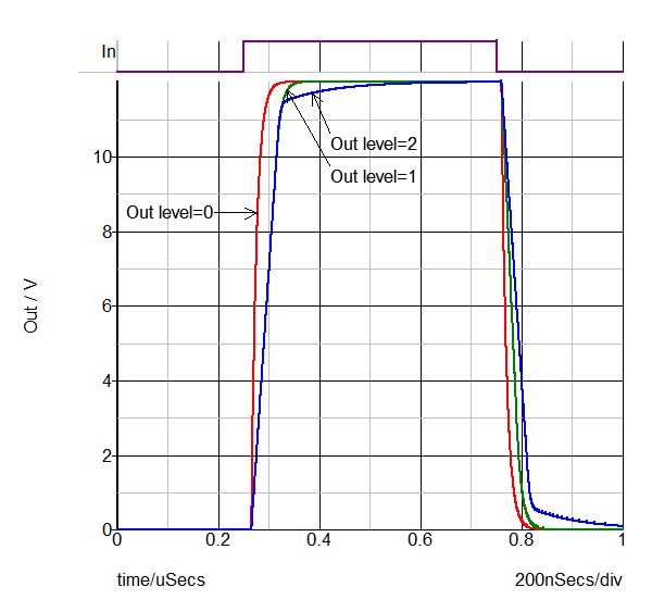 The MOSFET driver output waveforms for each of the three model levels is shown below.