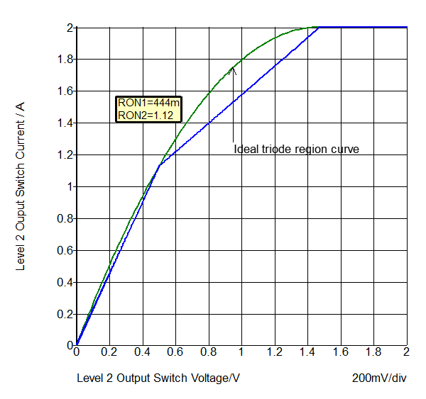 A more detailed MOSFET transistor can be modeled by changing the RON1 and RON2 parameters. In the below graph, the RON1 parameter is 444mΩ and the RON2 parameter to 1.12Ω.