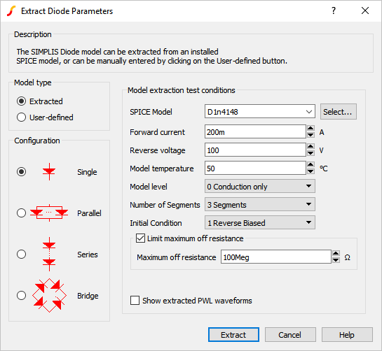 When you place a Diode symbol on a schematic, the Extract Diode Parameters dialog opens for you to edit the default test conditions. The default test conditions are defined using the command shell menu . For additional information, see SIMPLIS Diode Options.