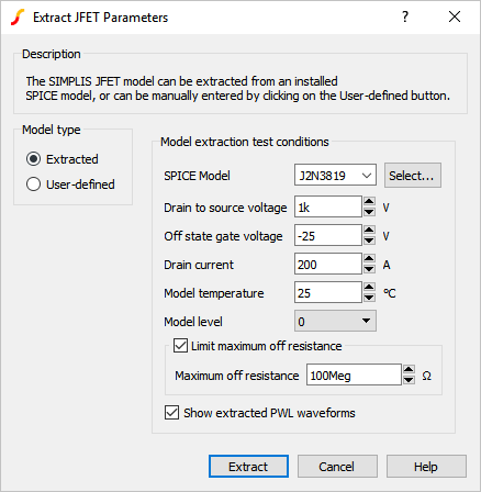 Any SPICE JFET model installed in the SIMetrix library can be converted for use in SIMPLIS. When a JFET is placed on a SIMPLIS schematic, a model parameter extraction routine is invoked to Converting SPICE Models for use in SIMPLIS - Overview. During the model parameter extraction process, SIMetrix/SIMPLIS automatically runs several SPICE simulations on the SPICE model and extracts the SIMPLIS model parameters. After the Piecewise Linear (PWL) model parameters have been extracted, the resulting JFET model will run in SIMPLIS.