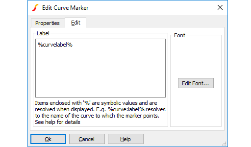 Label Text of the marker's label. %curve:label% automatically resolves to the curve's label. If the curve name is edited with menu Curves | Rename curve this value will reflect the change. You can of course enter any text in this box.