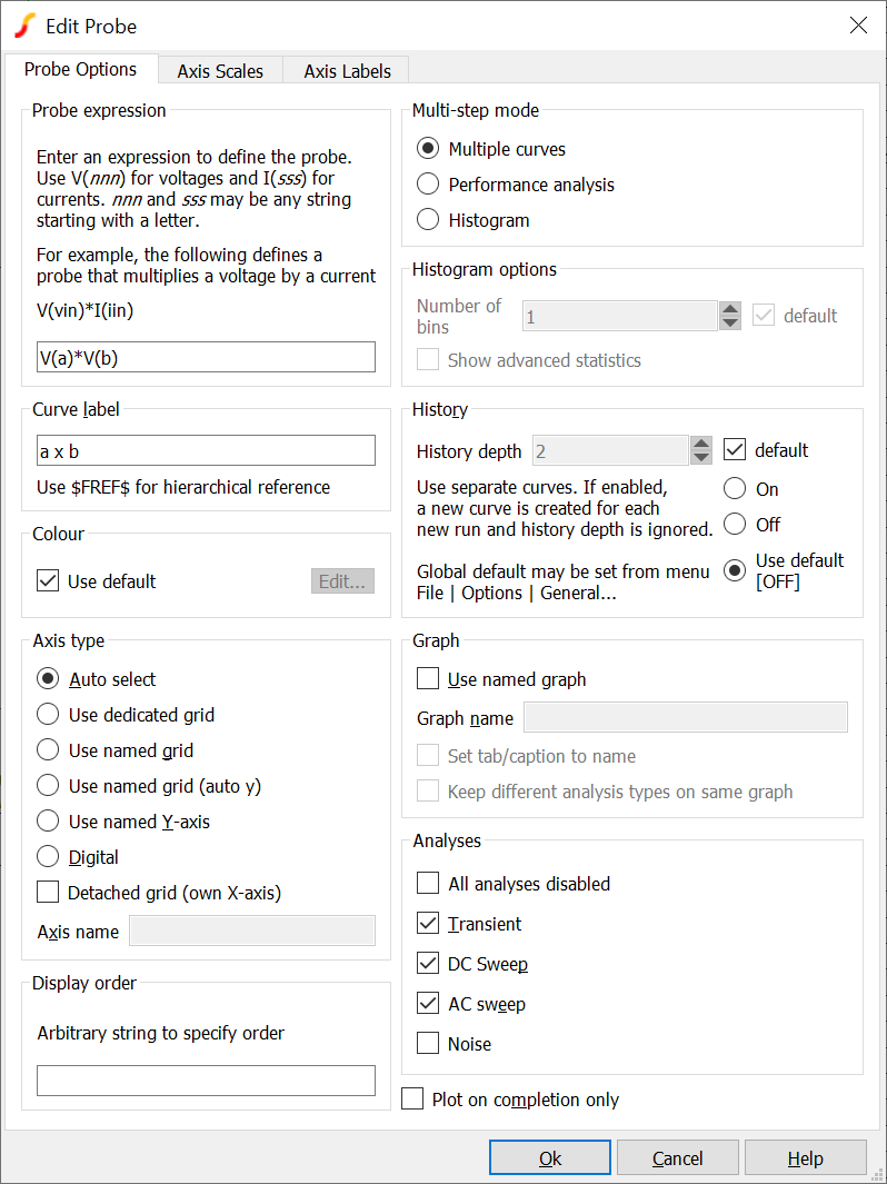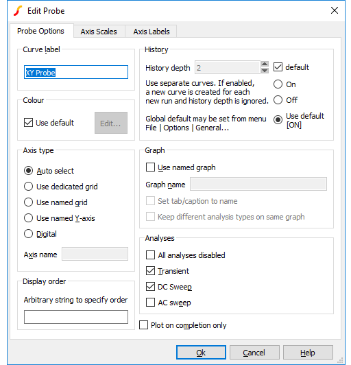 All probe types have a large number of options allowing you to customise how you want the graph plotted. For many applications the default settings are satisfactory. In this section, the full details of available probe options are described. Select the probe and press F7 or menu Edit Part...