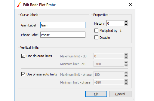 | Multiple Selections | If multiple Bode plot probes are selected before editing, all properties except the curve labels can be simultaneously changed for all probes. The curve label properties will remain unchanged for all selected probes |