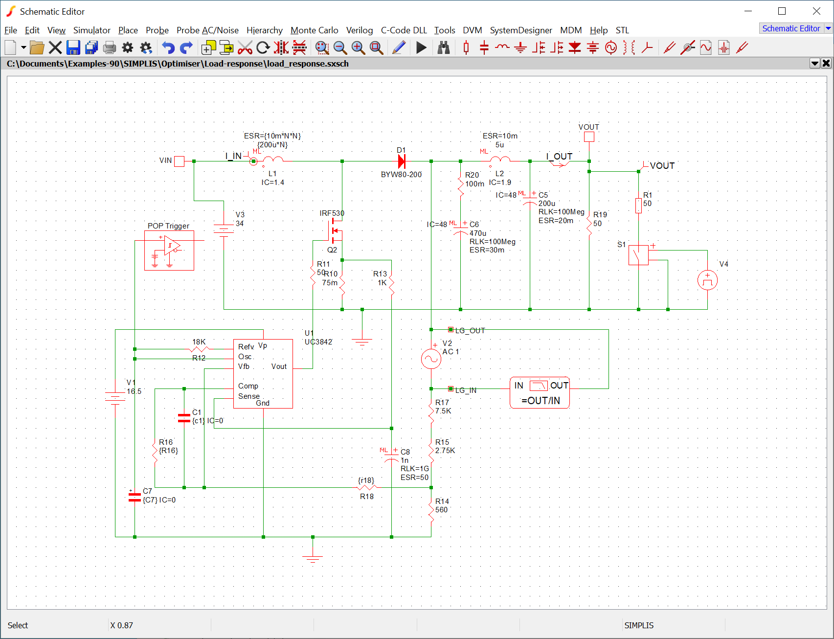 The circuit is a simple boost converter. The optimiser has been setup modify the compensation network to minimise the transient response to a load change while retaining the gain and phase margins within reasonable limits.