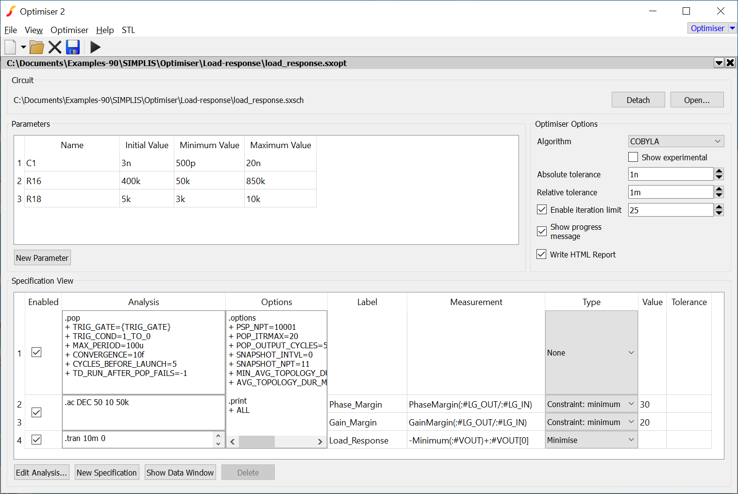 From the examples folder locate the file load_response.sxopt. Typically this will be located at Documents/SIMetrix/Examples-version/SIMPLIS/Optimiser/Load-response/load_response.sxopt. You can drag and drop the file into the SIMetrix environment or open it using menu then select Optimiser Files (*.sxopt) in the file selection drop down box then navigate to load_response.sxopt. You should see the Optimiser GUI open with the following setup: