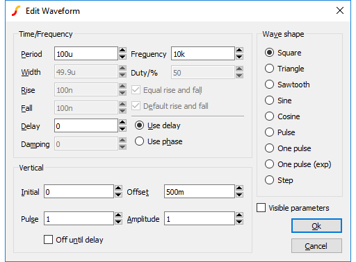 Select the wave shape on the right hand side then enter the parameters as appropriate. The following notes provide details on some of the controls.