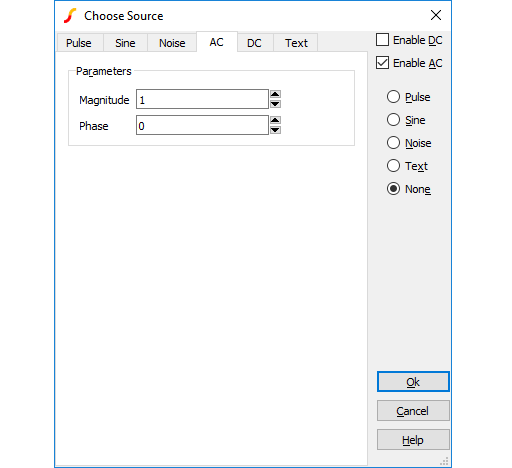 Sets the magnitude and phase of the source for AC analysis. To take effect the Enable AC check box must be checked.