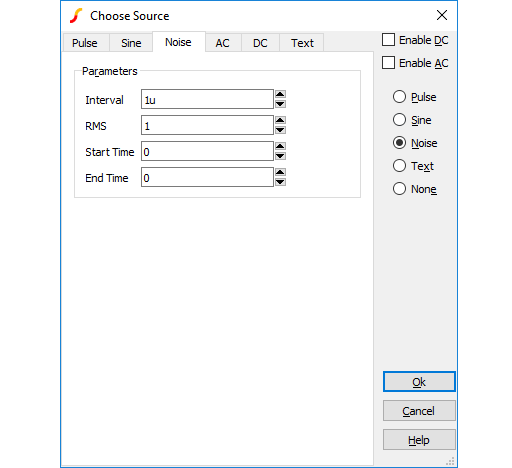 Start time and End time values may be entered to define the interval over which the noise signal is active. If End time is zero, the noise will continue to the end of the simulation.