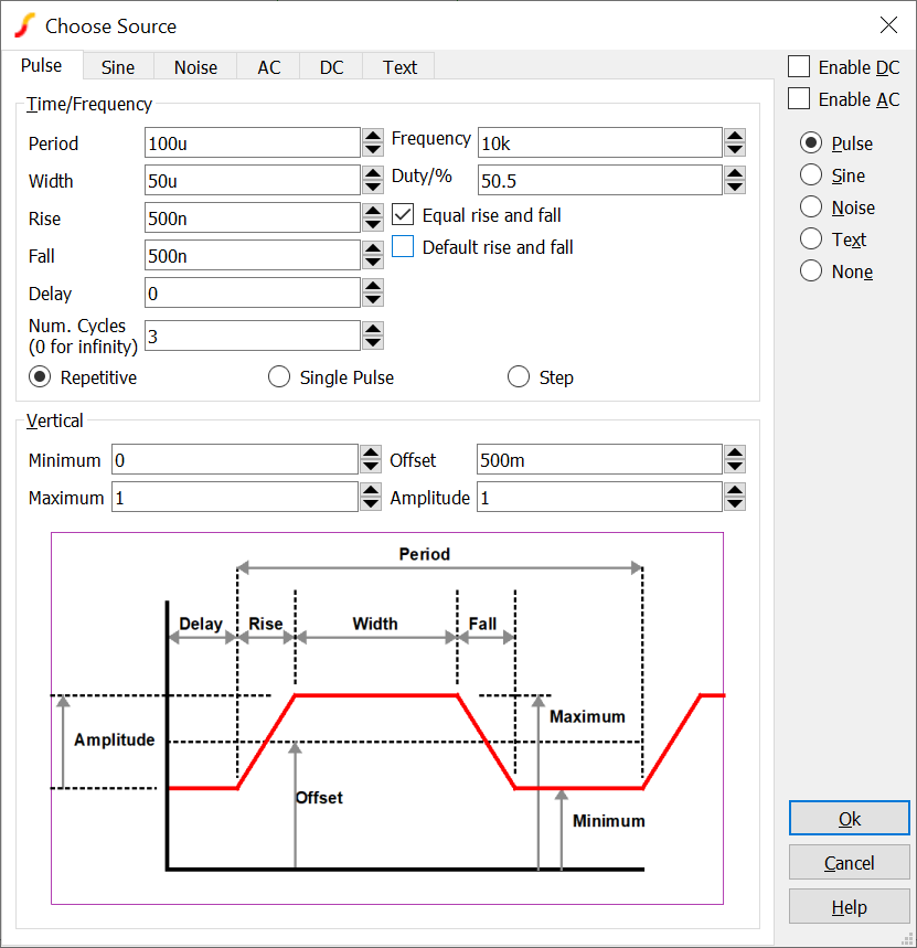All of the sources described above can be used in both SIMetrix and SIMPLIS modes of operation. In SIMetrix mode there is also a Universal source which provides the function of transient, AC and DC sources all in one device. In addition, the Universal source may be used to create a random noise source.