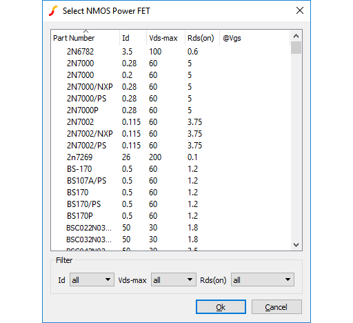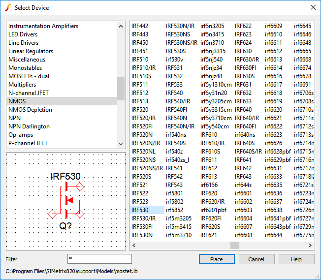 Select the appropriate category on the left then the part number on the right. The picture above shows what you would see if selecting an IRF530 from the NMOS category. If you are not sure what category the part is in, select the '* All Devices *' category which you will find at the bottom of the category list.
