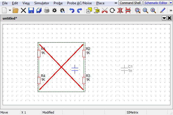 Moving an element into a group with warning of group destruction. The wires and resistors have been grouped together. The capacitor is being dragged over the grouping. A warning box with a red cross appears around the group to indicate that placing the capacitor here would break the grouping of the elements.