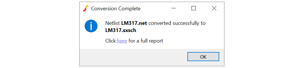 3. If the conversion is successful, the schematic will open automatically. A message box similar to the picture below will also be shown: A report on the conversion process is created and can be opened by clicking the link in the message box. The report lists the schematic files created any files renamed to avoid overwriting. (See details below)