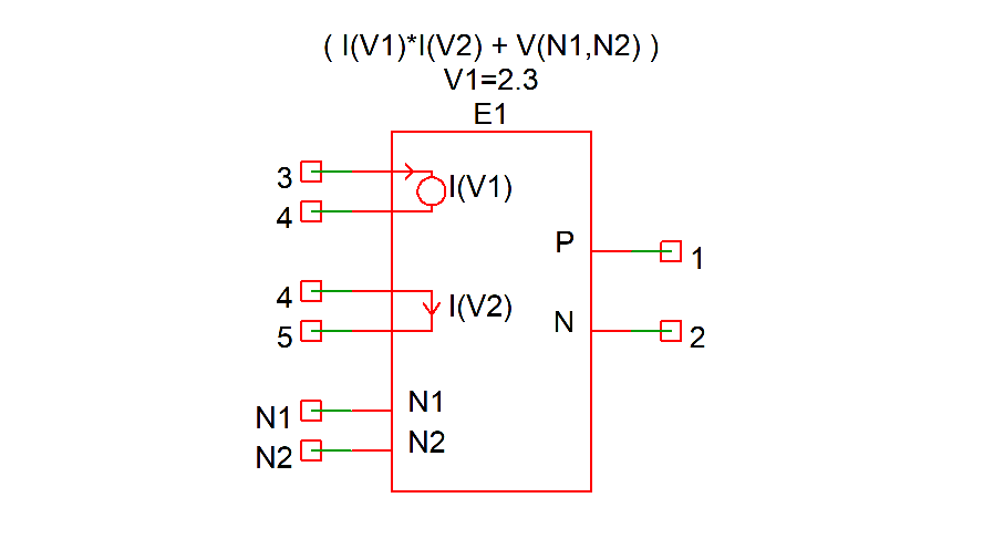 E1 1 2 VALUE = { I(V1)*I(V2) + V(N1,N2) }