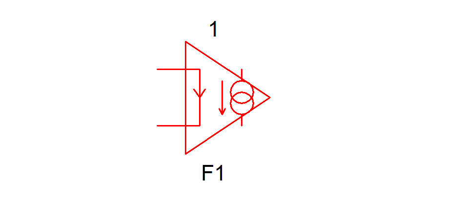 The voltage source V1 is represented by the input with the current direction arrow. That is both F1 and V1 lines in the netlist will be represented by the above symbol.