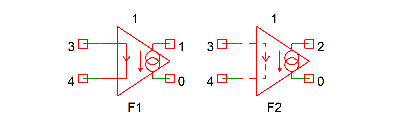 In the above only F1 incorporates the V1 voltage source. F2, whose input is represented by a broken line does not include V1 but references it indirectly. For convenience, F2 is configured so that if the current into its inputs is probed, the plotted value will be the correct V1 current. However this current does not actually flow into the input of F2 but is used by F2 to control its output current. Electrically the circuit as a whole will behave correctly and identically to the original netlist.