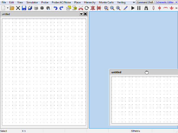 By default the View's will split to take up half of the available space when placed next to each other. They can be resized by moving the cursor in-between them until the cursor shown is visible, then dragging them to the required size, as shown in the figure below of two schematics placed side-by-side.