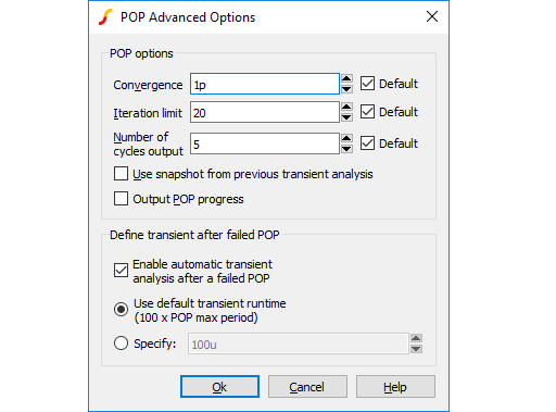 Enable automatic transient analysis after a failed POP If POP fails, a transient analysis automatically follows. This is to help diagnose the cause of POP failure but is also useful in some cases where a subsequent transient may settle sufficiently to perform a study of load transient behaviour. For further details, refer to the SIMPLIS Reference Manual. See SIMPLIS Reference Manual/Simplis-POP/tatements Relating to POP Analysis/.POP/Statement for POP Analysis/Behaviour of POP Analysis after POP Convergence Failure.
