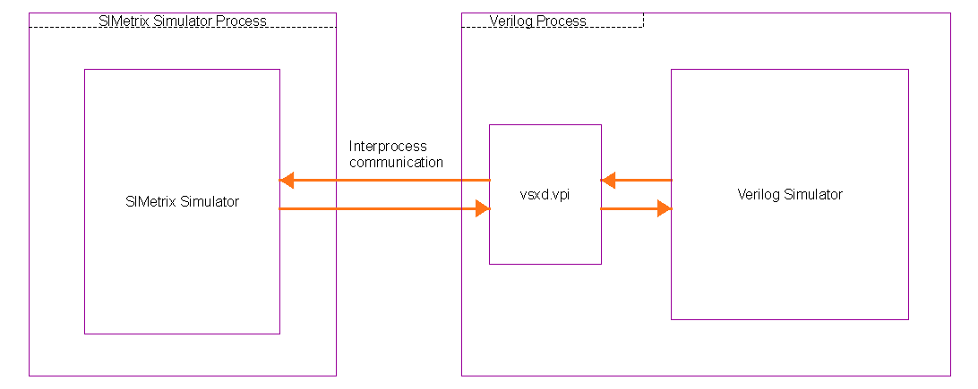 vsxd.vpi is a DLL/shared library that is provided as part of SIMetrix. This is loaded by the external Verilog simulator and runs in the Verilog process's memory space. vsxd.vpi uses the VPI interface to send events to the Verilog simulator, to respond to events generated by the Verilog simulator and to interrogate the Verilog simulator about details of the user's Verilog module.